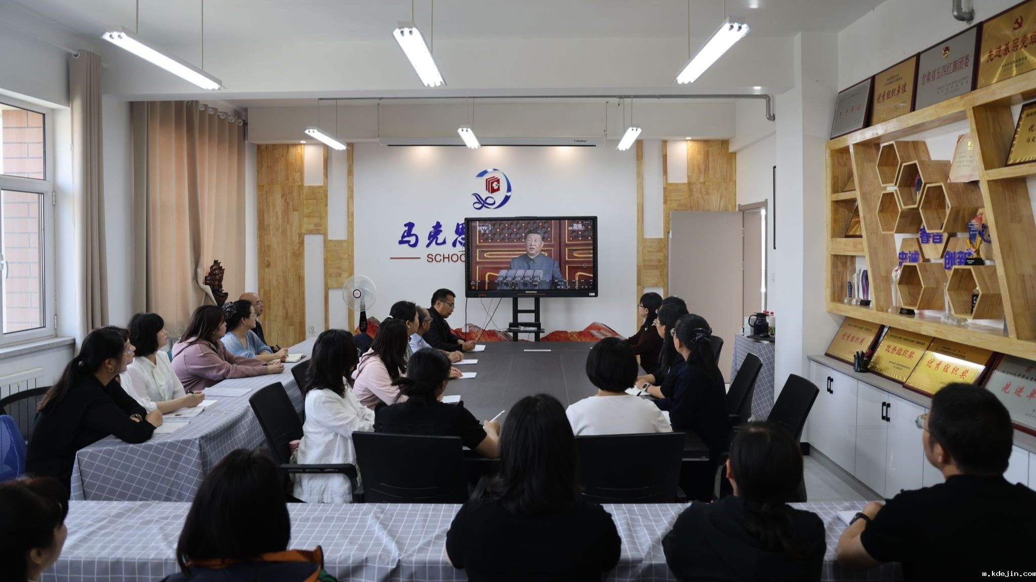 校党委书记梁兆光等在家校领导、党委常委和校党委理论学习中心组成员在第十教学楼教室集中观看。各二级学院、机关党委、团委等单位积极组织无课师生、机关干部和学生代表集中收看。全校教职员工、医护人员、在校学生分别利用电视、网络等多种渠道实时观看大会盛况。