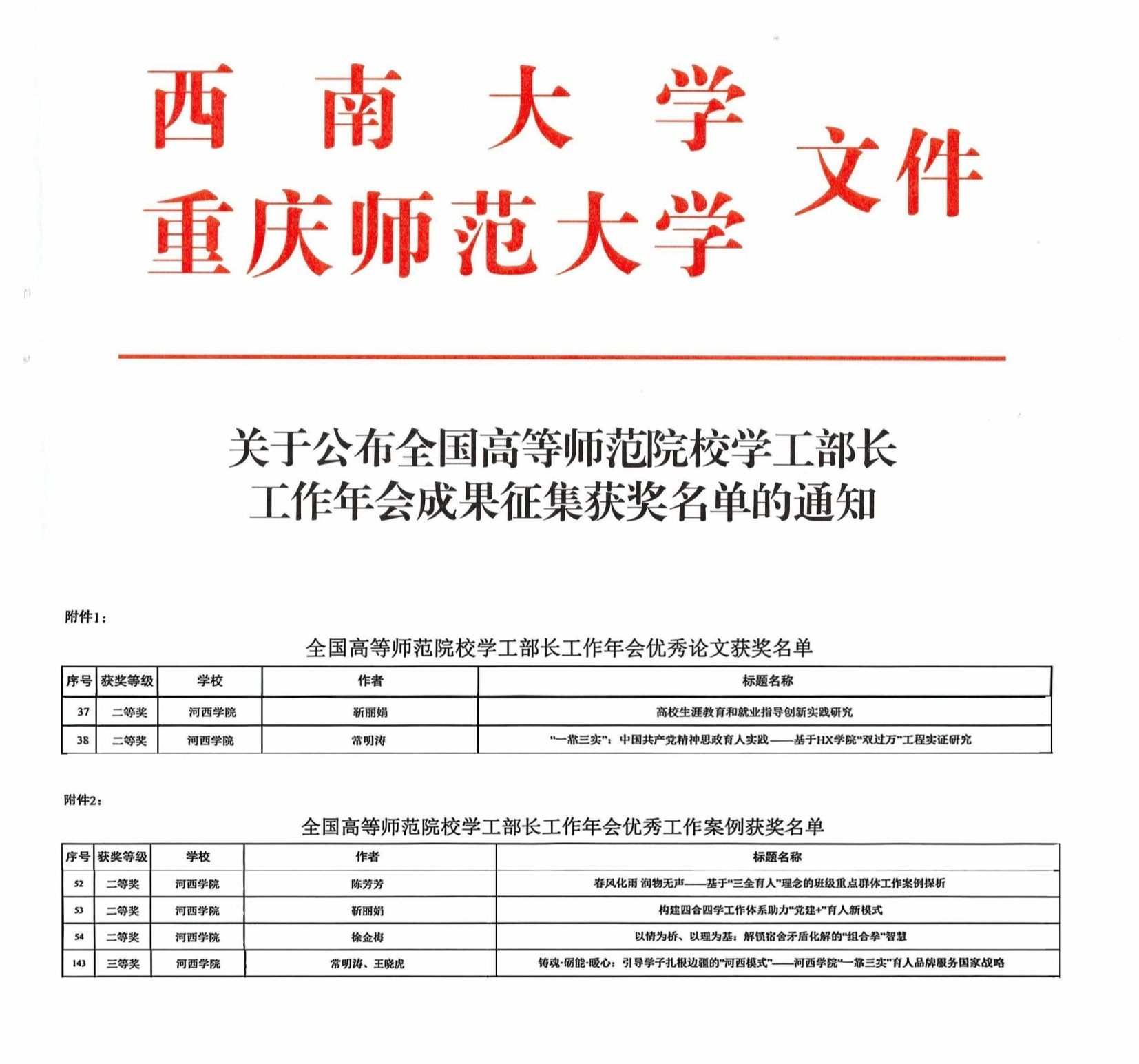 10月22—24日,全国高等师范院校学工部长工作年会在重庆师范大学召开。此次工作年会成果征集活动得到广泛响应,共收到论文210余篇、工作案例430余篇,集中展现了各高校在学生工作中的创新实践与理论探索。我校报送的工作案例和论文在年会成果征集中获奖,其中3个工作案例、2篇论文荣获二等奖,1个工作案例获三等奖。此次会议由西南大学与重庆师范大学共同承办,北京师范大学、华东师范大学等46所高等师范院校200多位学工干部参加会议,...